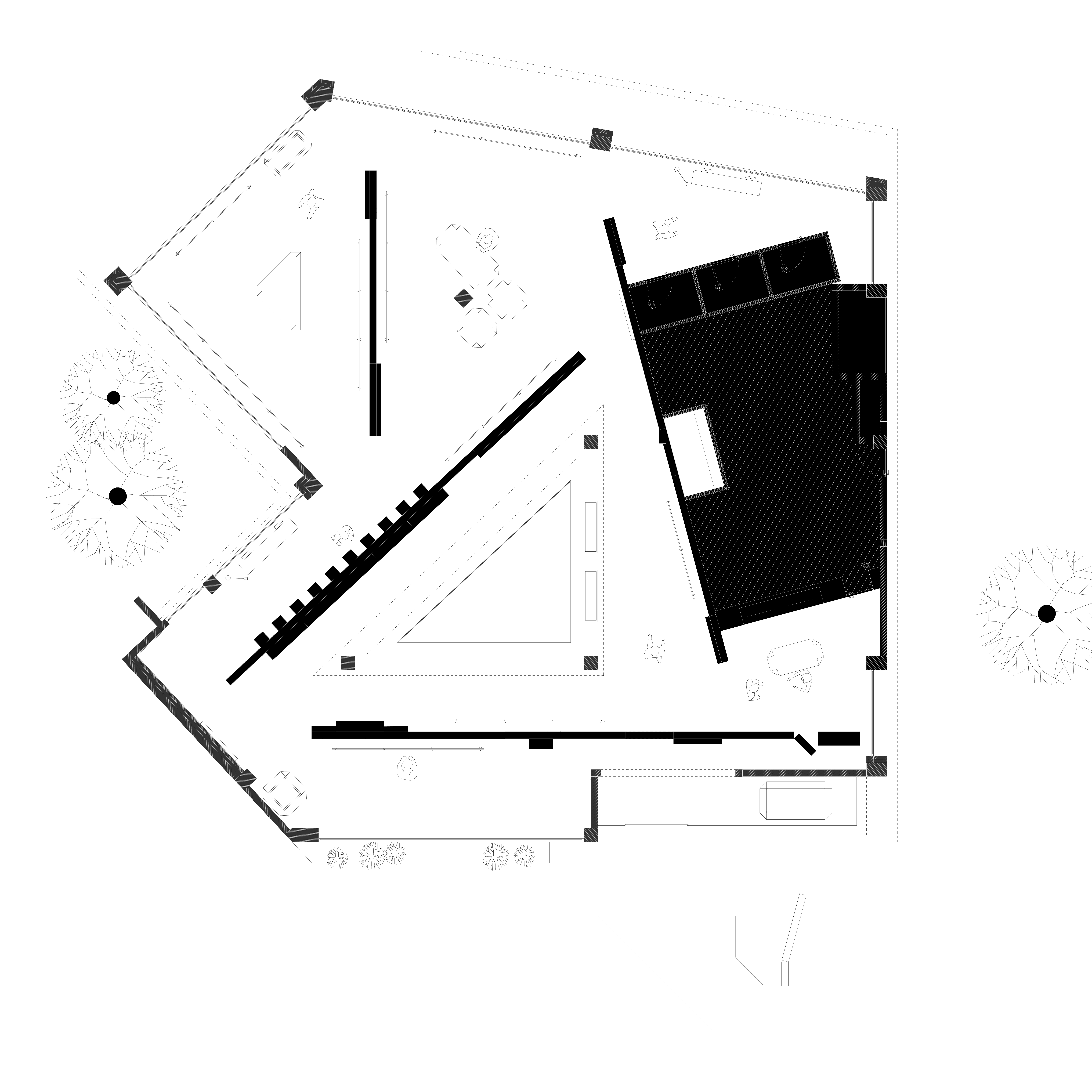 A TRIANGULAR ATRIUM AND THE ADJACENT LAKESIDE METASEQUOIA GROVE TOGETHER FORM BOTH INWARD- AND OUTWARD-FACING LANDSCAPES, SERVING AS THE GENESIS OF THE DESIGN. LEVERAGING THE ORIGINAL ARCHITECTURAL ATRIUM STRUCTURE, A PERFECT TRIANGULAR COURTYARD IS OUTLINED—AN ATTEMPT TO EMBRACE AND ENVELOP A PIECE OF THE SCENERY WHILE FULLY OPENING UP TO THE EXPANSIVE BLUE SKIES OVER LAKE LUO. FOUR WHITE WALLS, POSITIONED IN RELATION TO THE COURTYARD, DELINEATE THE SPACE INTO INNER AND OUTER LAYERS. THE THREE WHITE WALLS ENCIRCLING THE ATRIUM ARE NOT PERFECTLY PARALLEL TO ITS SIDES BUT INSTEAD FORM SUBTLE ANGLES, NARROWING OR WIDENING TO REVEAL GLIMPSES OF THE DISTANT METASEQUOIAS AND INVITING DEEPER EXPLORATION.