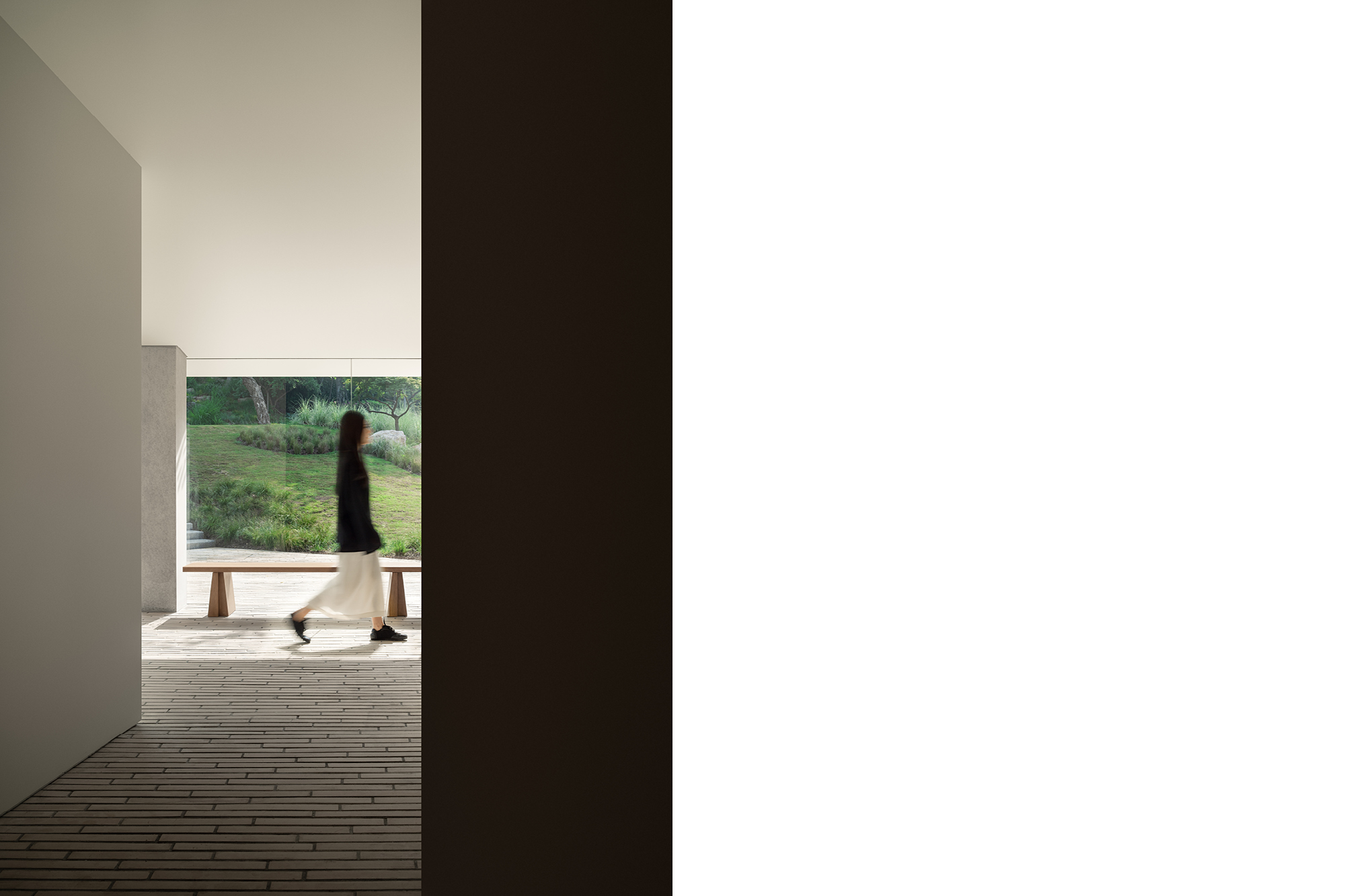 一道白色的墙体将空间分为内外两部分。外部,是“树屋”的会客厅,通透的玻璃幕墙将原就斑驳的树影映照得更为婆娑,轻松而惬意,自然是房间的主题。穿过墙体,到达内向而私密的主零售空间,更多服装和饰品被细致地陈列于此,却又不吝向前来的客人展示,温暖而慷慨。墙体的厚度足以将更衣、收银等功能悄然容纳其中,使外部空间足够纯净。