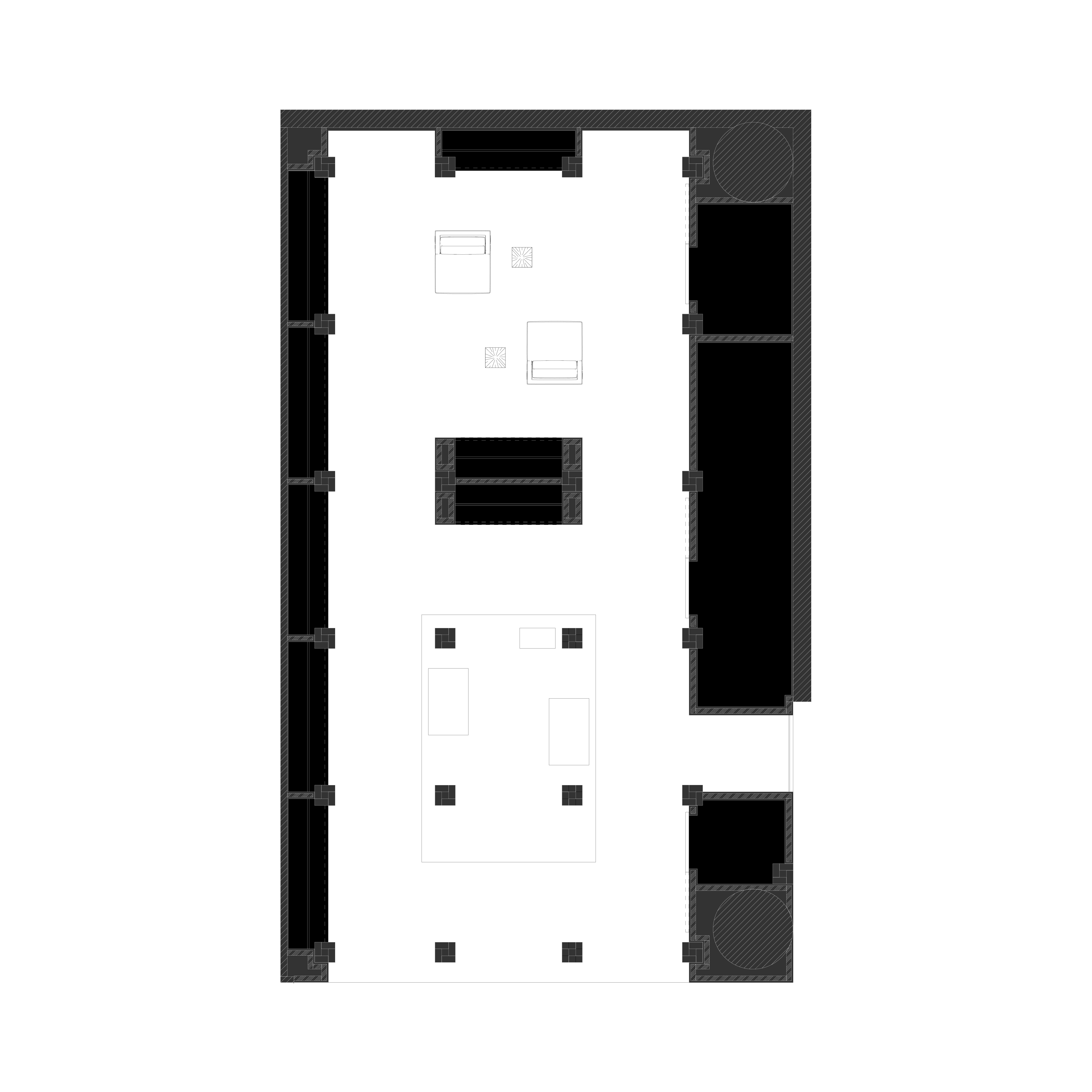 作为空间的核心,向来容纳空间的主角。内核空间层层递进,依据前后被分为三进:第一进的四根立柱承托起一张厚重的黑色方形木桌,直观展现立柱的结构性质,宽大的桌面以现代而克制的手法开小洞,兼具桌面陈列、配饰收纳以及收银功能;第二进的两根立柱被完全嵌平于一个白色体块之中,立体的陶砖抽象为平面符号,最能体现与“M”的关联,体块作为空间前后的分界,亦可用作重点服饰的展示性陈列;第三进空间在标准柱网中抽去两根,独占两间,中间无柱,与传统木构中减柱法的智慧不谋而合,被定义为最深处的休闲区。两组藤编座椅和边几被相对放置于中央,藤编材质和曲线造型在林立的柱网中提供了一丝轻快的度假感受。