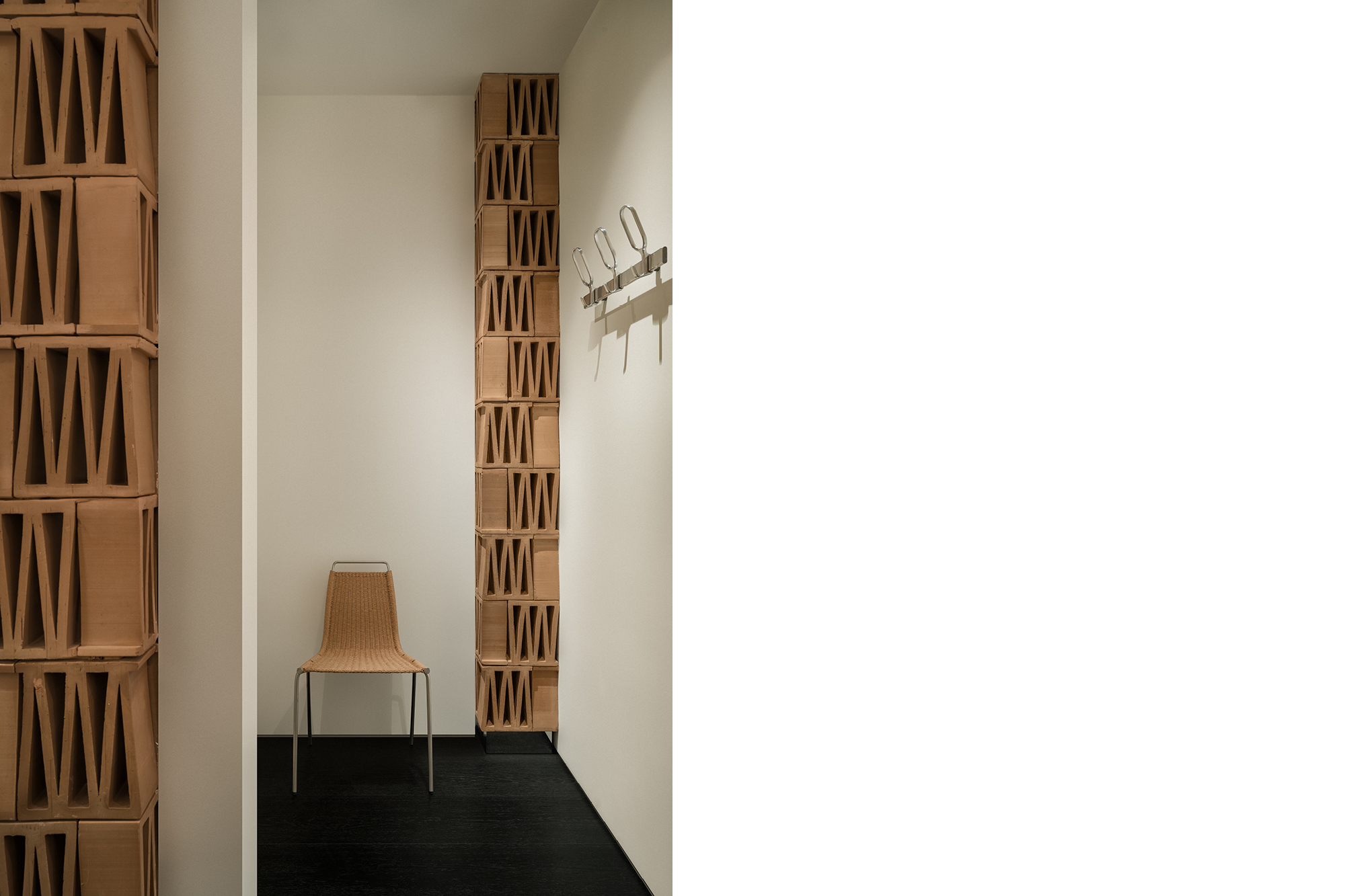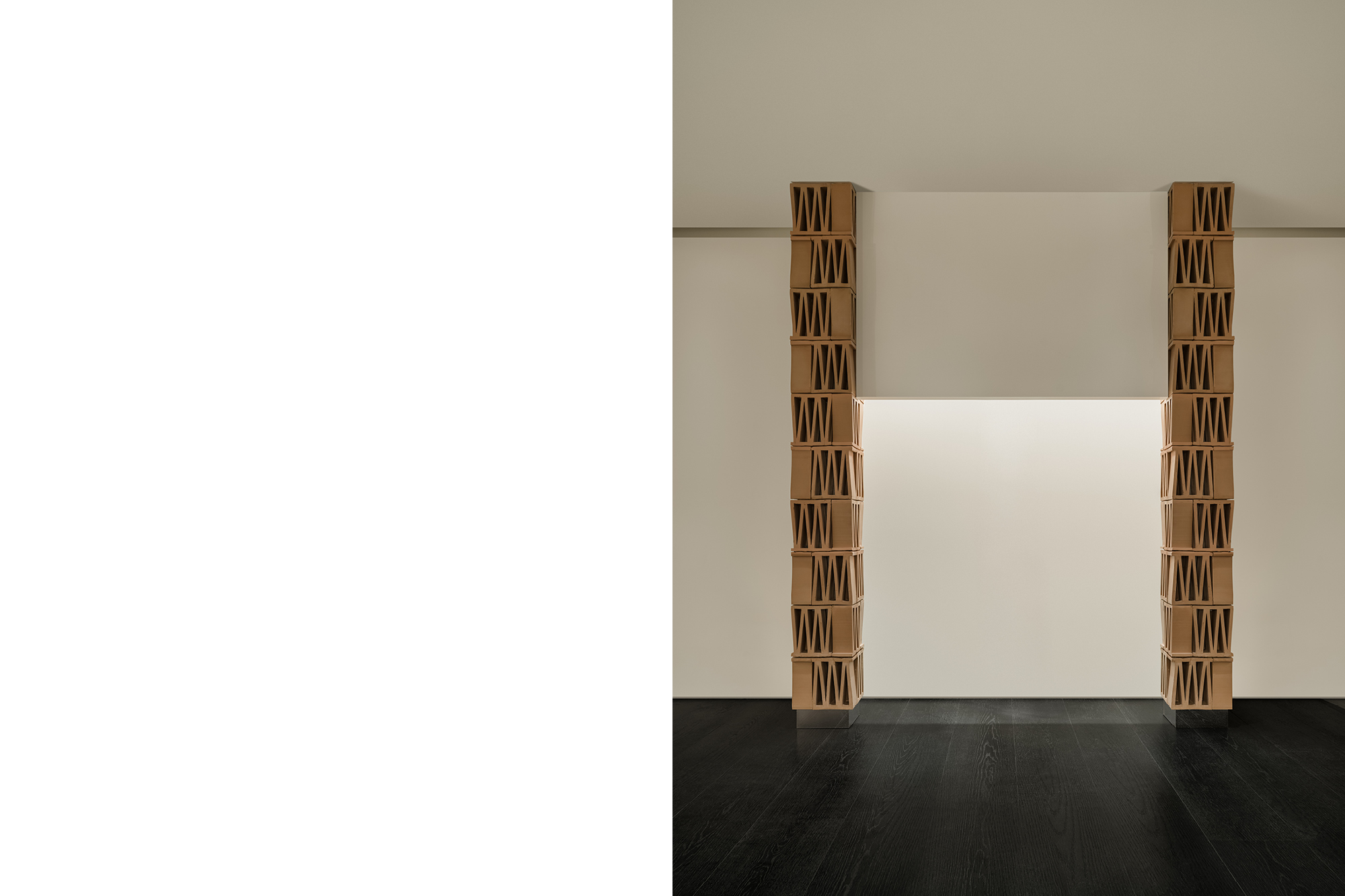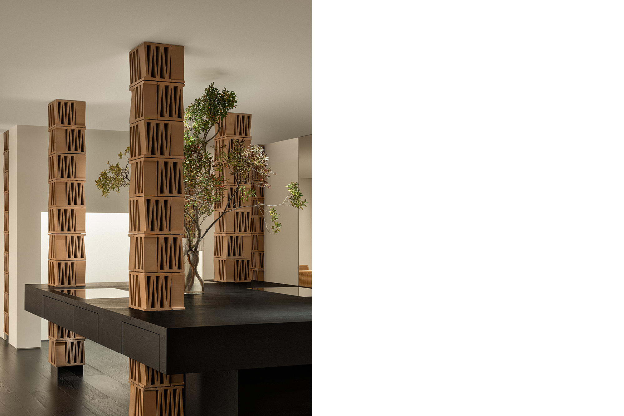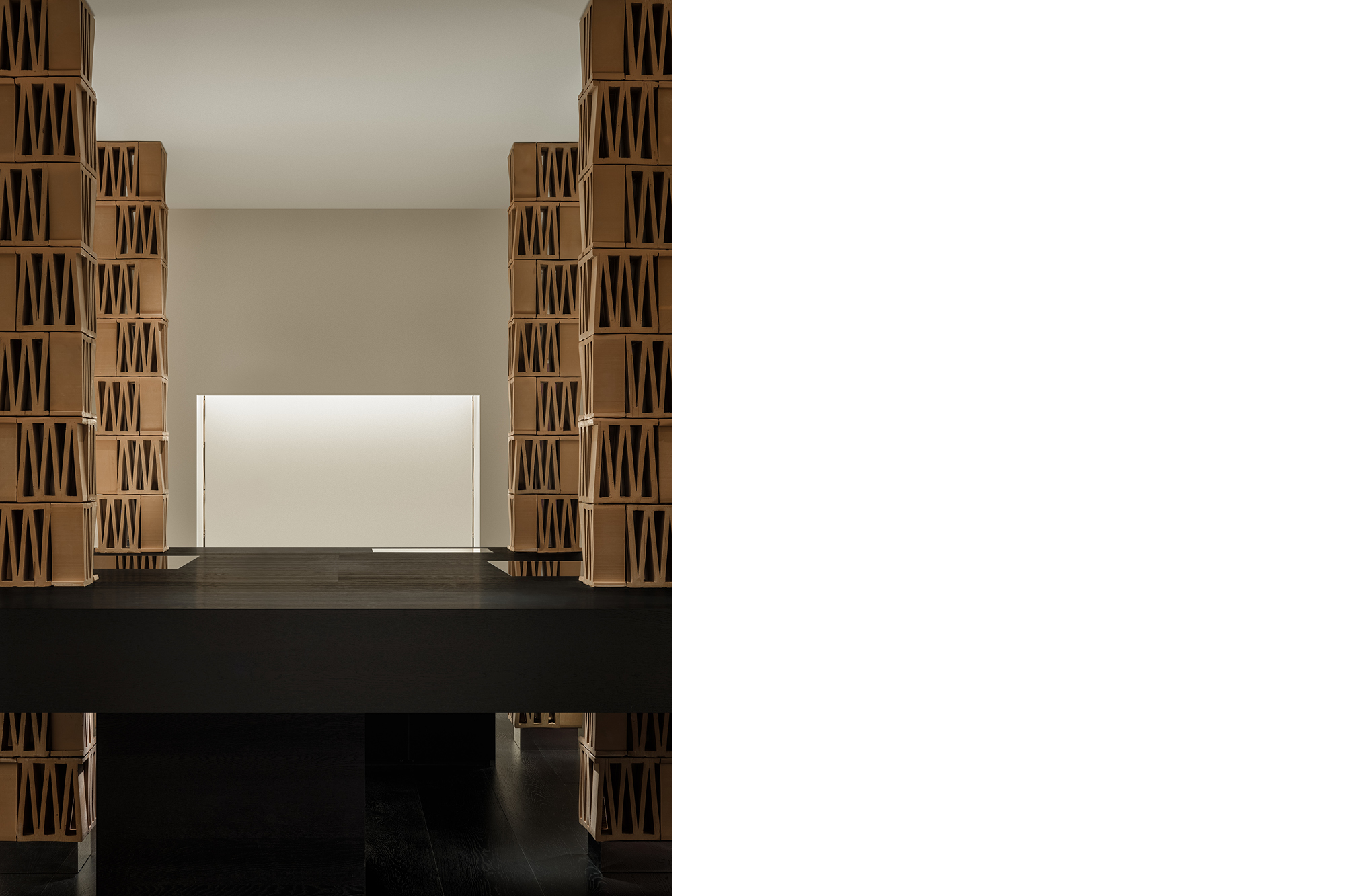 这个极简空间对“M”的诠释从结构单体开始。选自MUTINA的CELOSIA陶砖以其独特的几何镂空造型为特点,每块砖中都包含一个“M”形,成为这个项目中诠释品牌符号的物质载体。以四块砖为一组垒成立柱,层与层之间上下颠倒,相互交错,梯形的单体砖块经过层叠组合,赋予了立柱微妙起伏的外轮廓造型,令人联想起CONSTANTIN BRÂNCUȘI的雕塑作品。