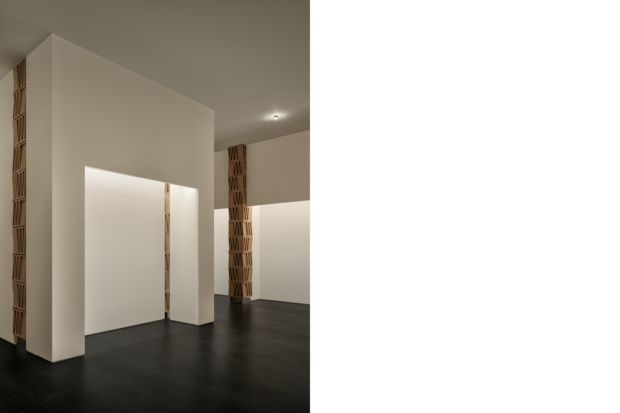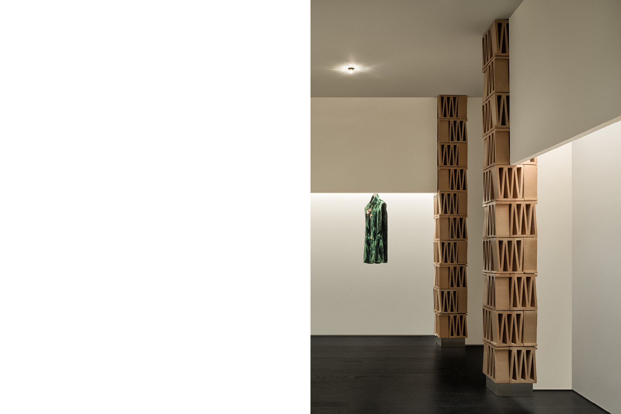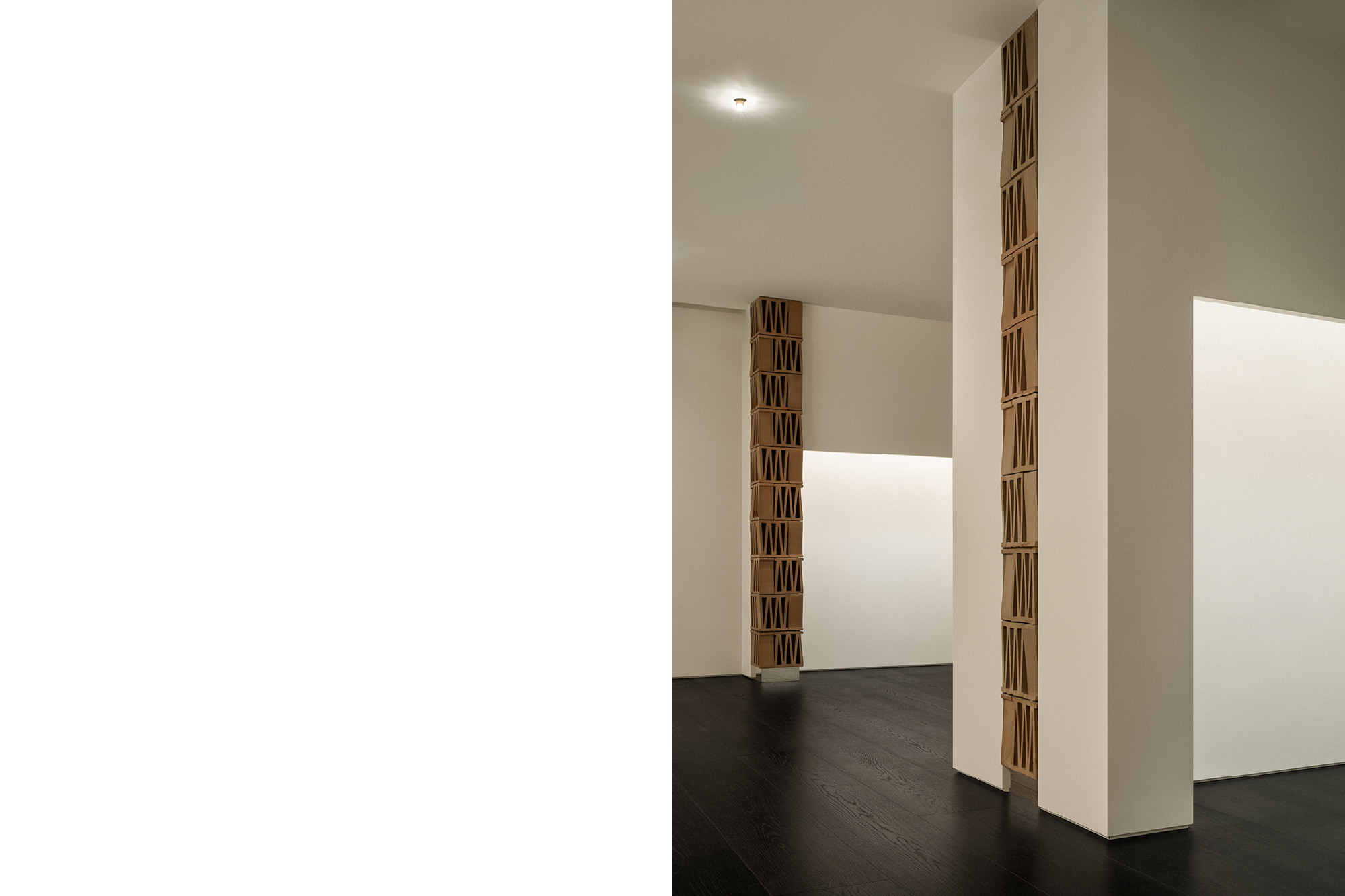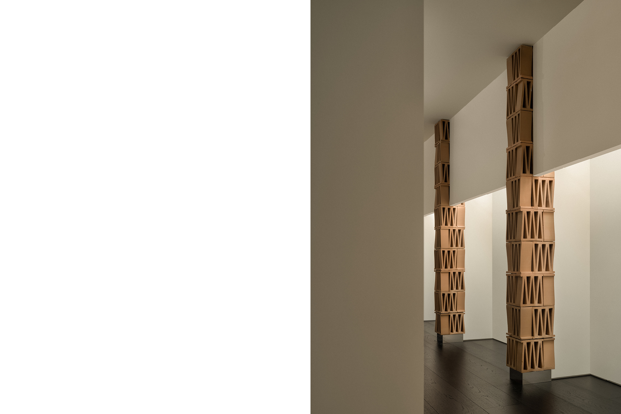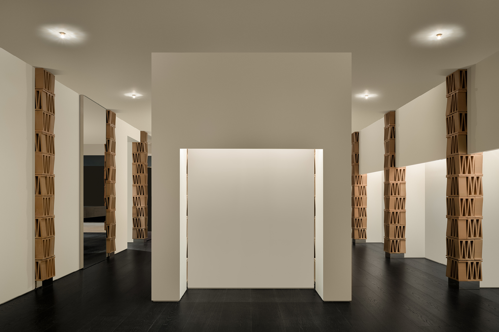 这个极简空间对“M”的诠释从结构单体开始。选自MUTINA的CELOSIA陶砖以其独特的几何镂空造型为特点,每块砖中都包含一个“M”形,成为这个项目中诠释品牌符号的物质载体。以四块砖为一组垒成立柱,层与层之间上下颠倒,相互交错,梯形的单体砖块经过层叠组合,赋予了立柱微妙起伏的外轮廓造型,令人联想起CONSTANTIN BRÂNCUȘI的雕塑作品。