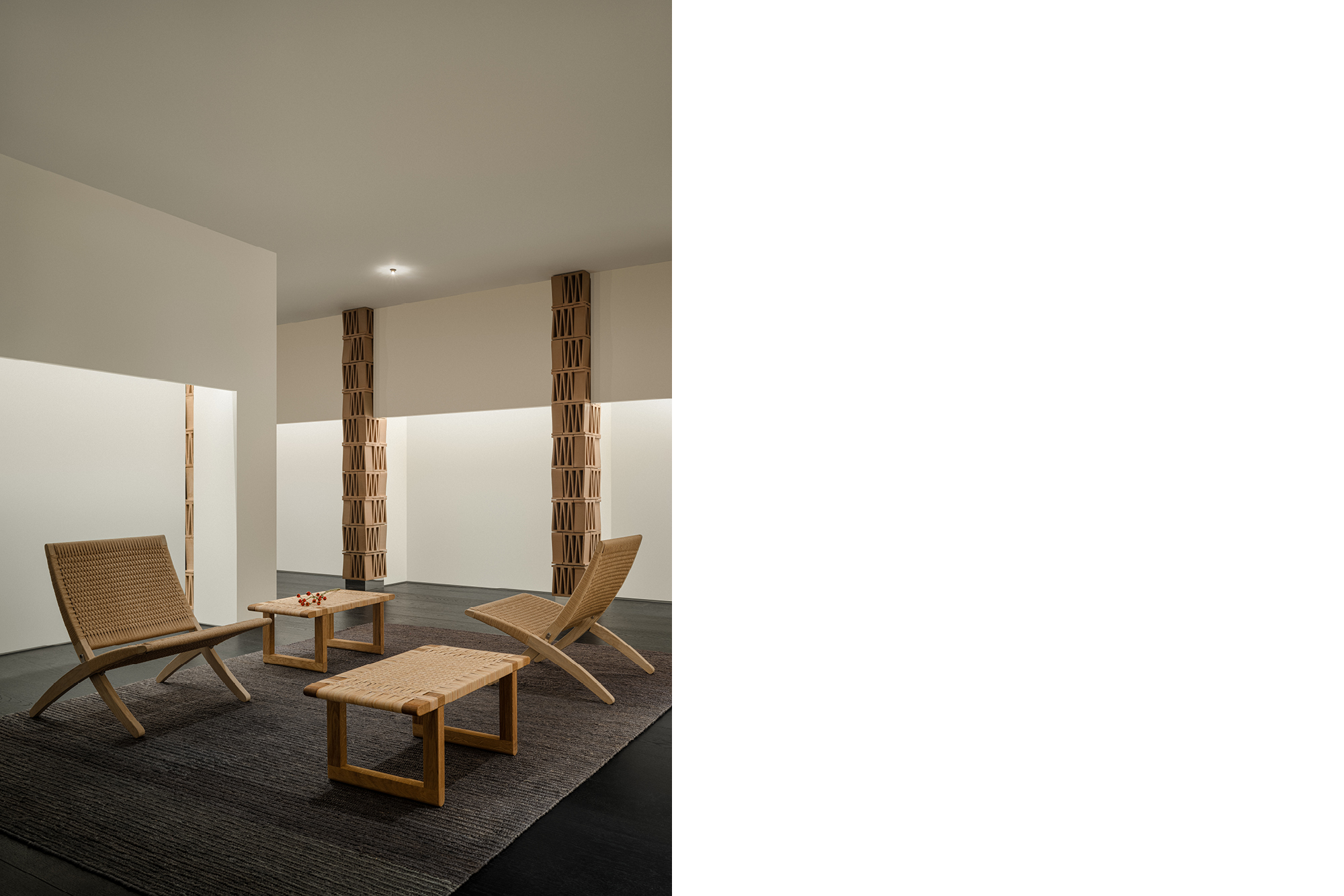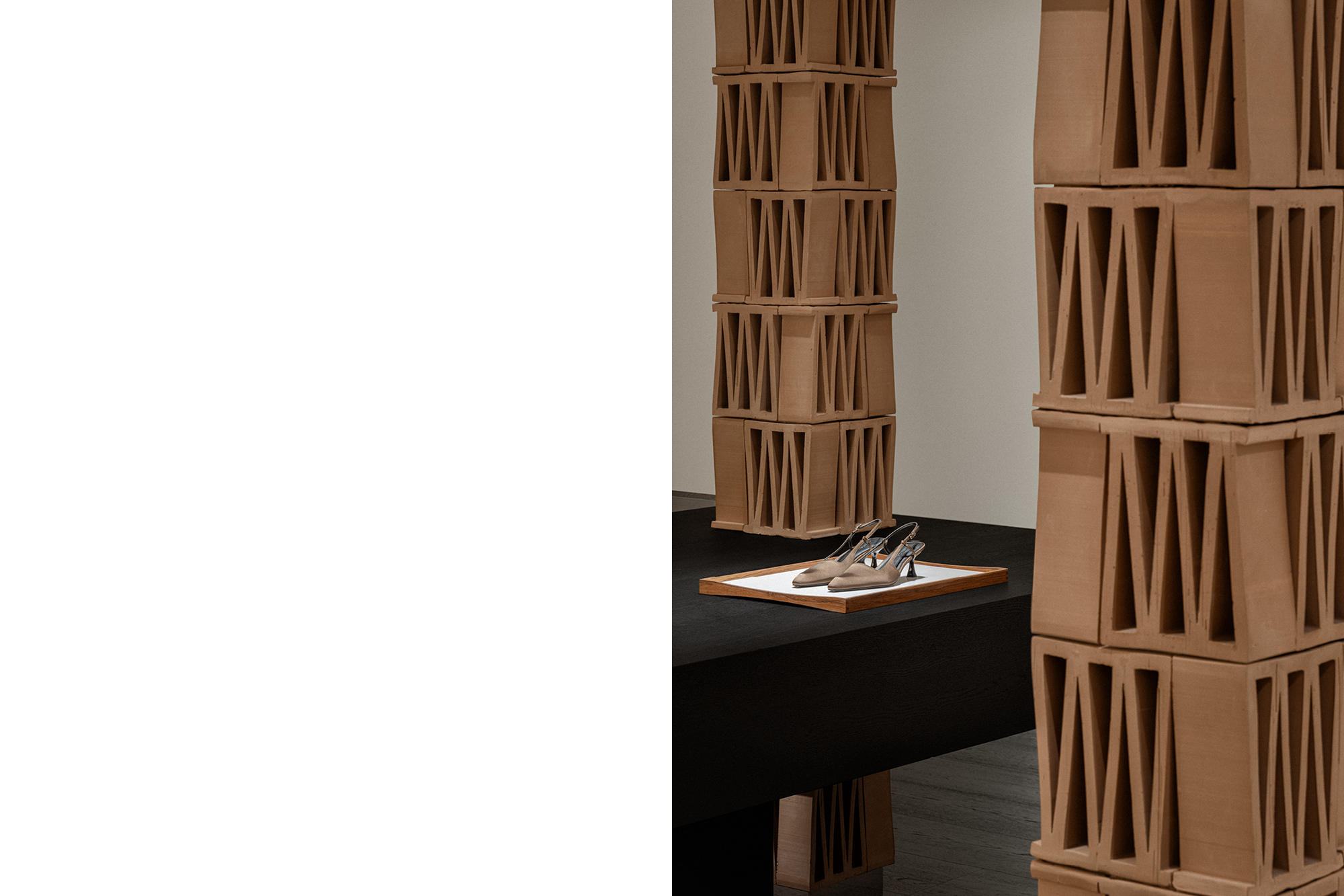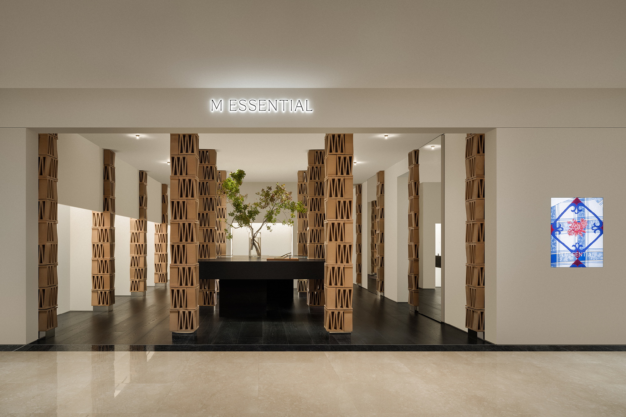 THE MINIMALIST INTERPRETATION OF “M” BEGINS WITH STRUCTURAL UNITS. CELOSIA CERAMIC TILES FROM MUTINA, CHARACTERIZED BY THEIR DISTINCTIVE GEOMETRIC PERFORATIONS, EACH CONTAIN AN “M” SHAPE, SERVING AS THE MATERIAL EMBODIMENT OF THE BRAND’S SYMBOL IN THIS PROJECT. GROUPED IN SETS OF FOUR TO FORM PILLARS, EACH LAYER IS INVERTED AND INTERLOCKED WITH THE NEXT. THE TRAPEZOIDAL TILES, WHEN LAYERED, CREATE A SUBTLY UNDULATING SILHOUETTE REMINISCENT OF CONSTANTIN BRÂNCUȘI’S SCULPTURAL WORKS.