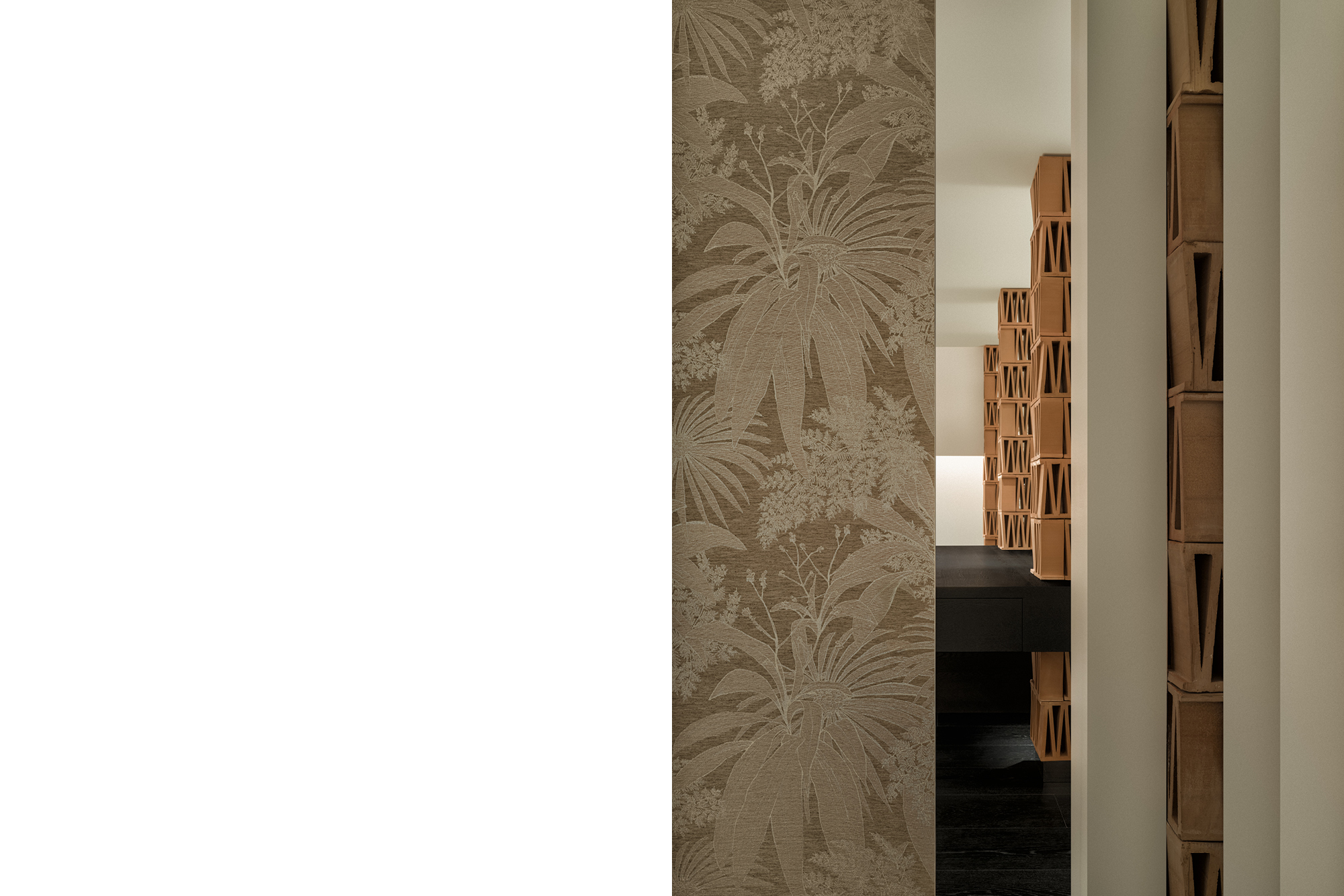 THE PILLARS APPEAR IN THE SPACE AS MULTIFACETED OR SINGLE-FACED ELEMENTS, ADDING A LAYERED RHYTHM TO THE SMOOTH WHITE WALLS. AS THE FULL-HEIGHT MIRRORED SLIDING DOORS OPEN SLOWLY, THE EMBEDDED BACKS OF THE PILLARS BECOME VISIBLE INSIDE THE CHANGING ROOMS—A SEAMLESS SURPRISE. ONE SIDE OF THE CHANGING AREA FEATURES EMBROIDERED FLORAL FABRIC FROM SACHO, ECHOING THE RATTAN SEATING AND CERAMIC TILES. THESE THREE MATERIALS CONVEY A SHARED ARTISANAL QUALITY, REINFORCING THE RESORT-LIKE ATMOSPHERE OF SPACE M.